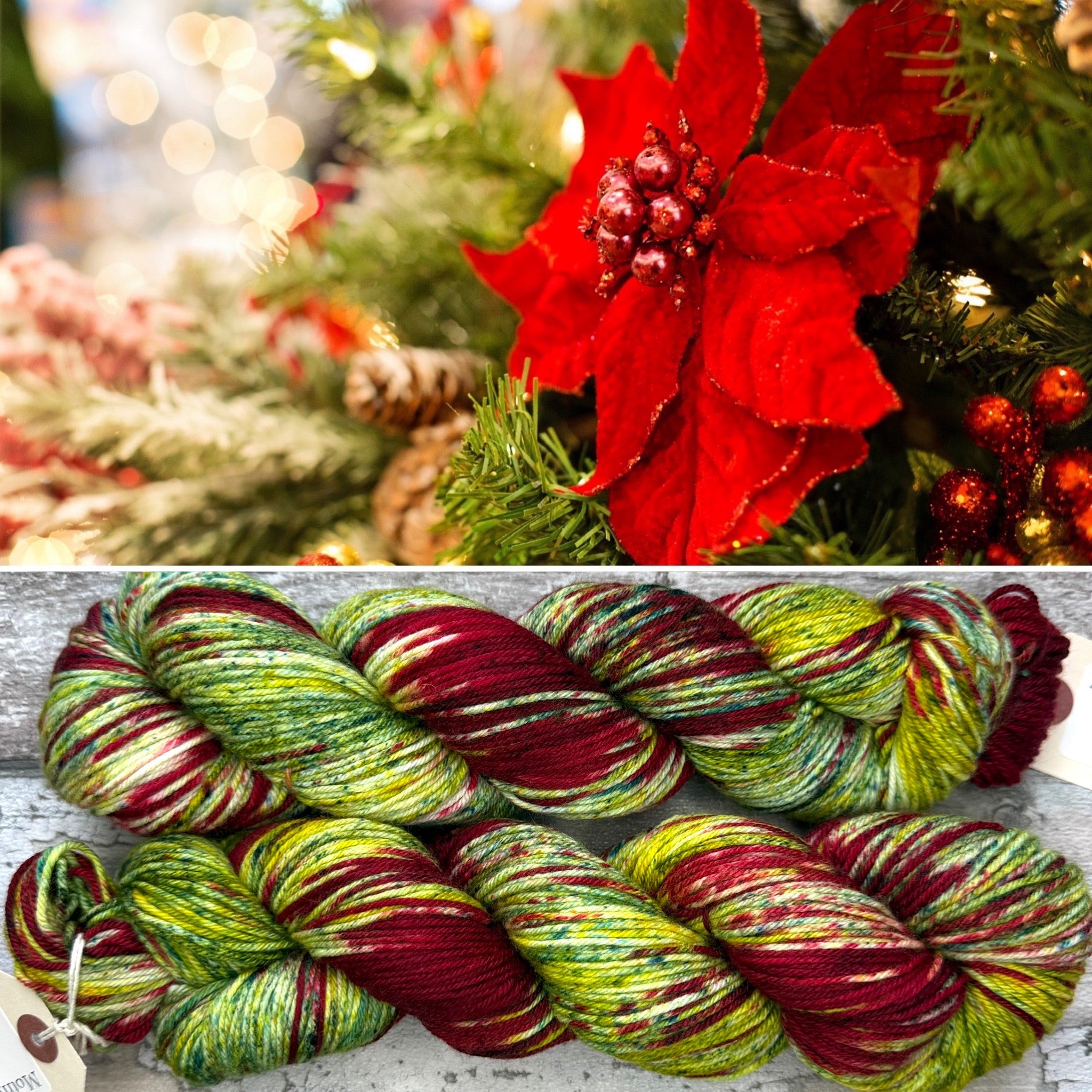 A mix of Poinsettia red and three greens (forest, moss and olive) on a snowy white yarn base. Each one is different and the balance of colours varies.