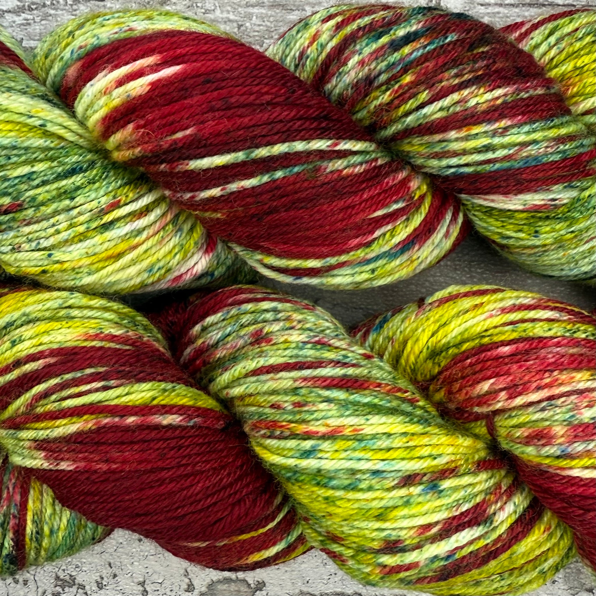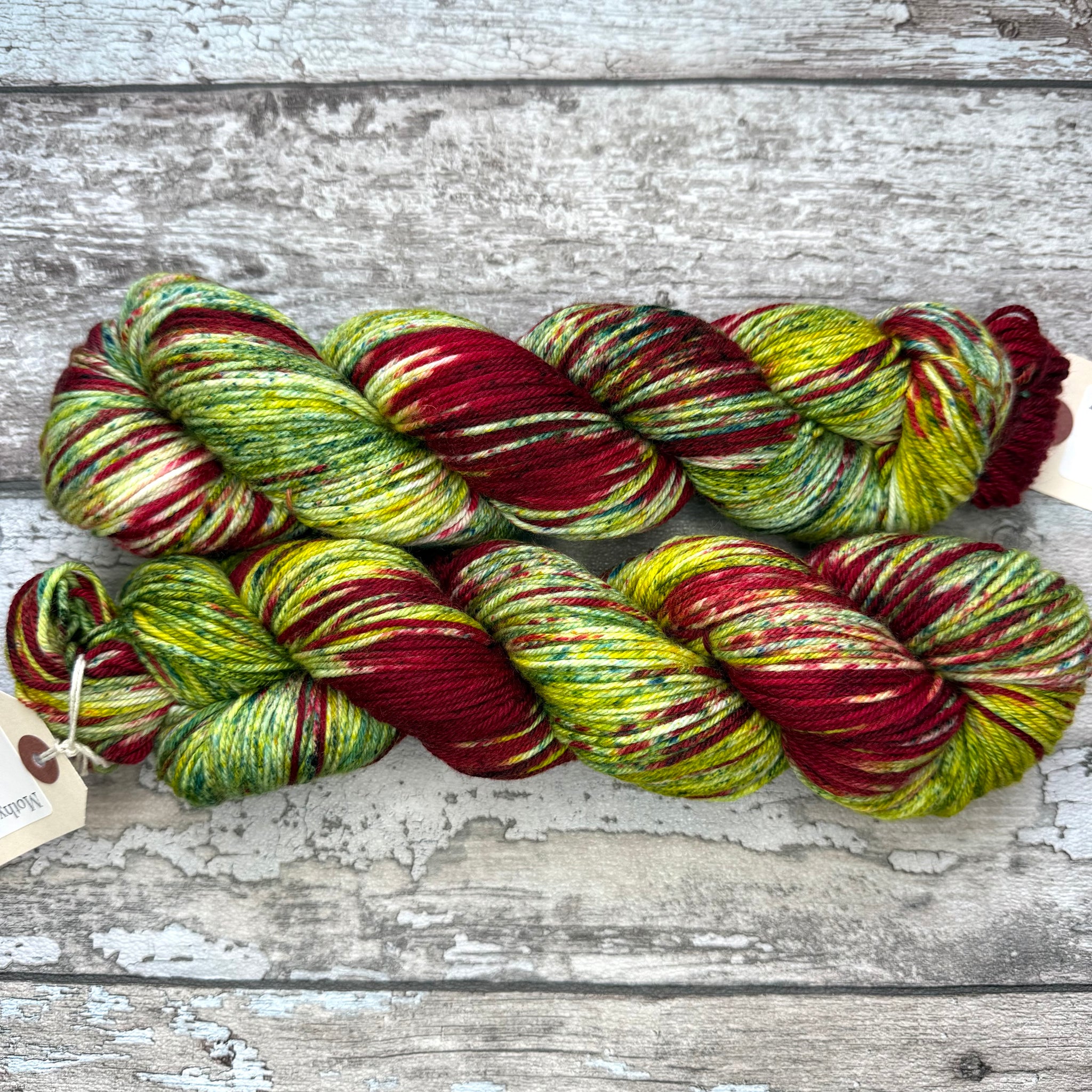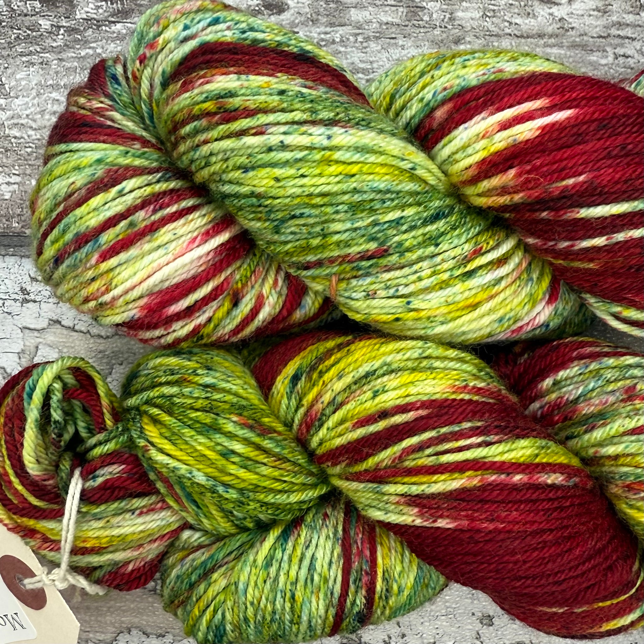 It's a superwash treated DK yarn that's soft and squooshy. It's spun from 75% merino wool with 25% nylon for enhanced durability. It is suitable for approximately 4-5mm needles. About 224 metres per 100g skein.
