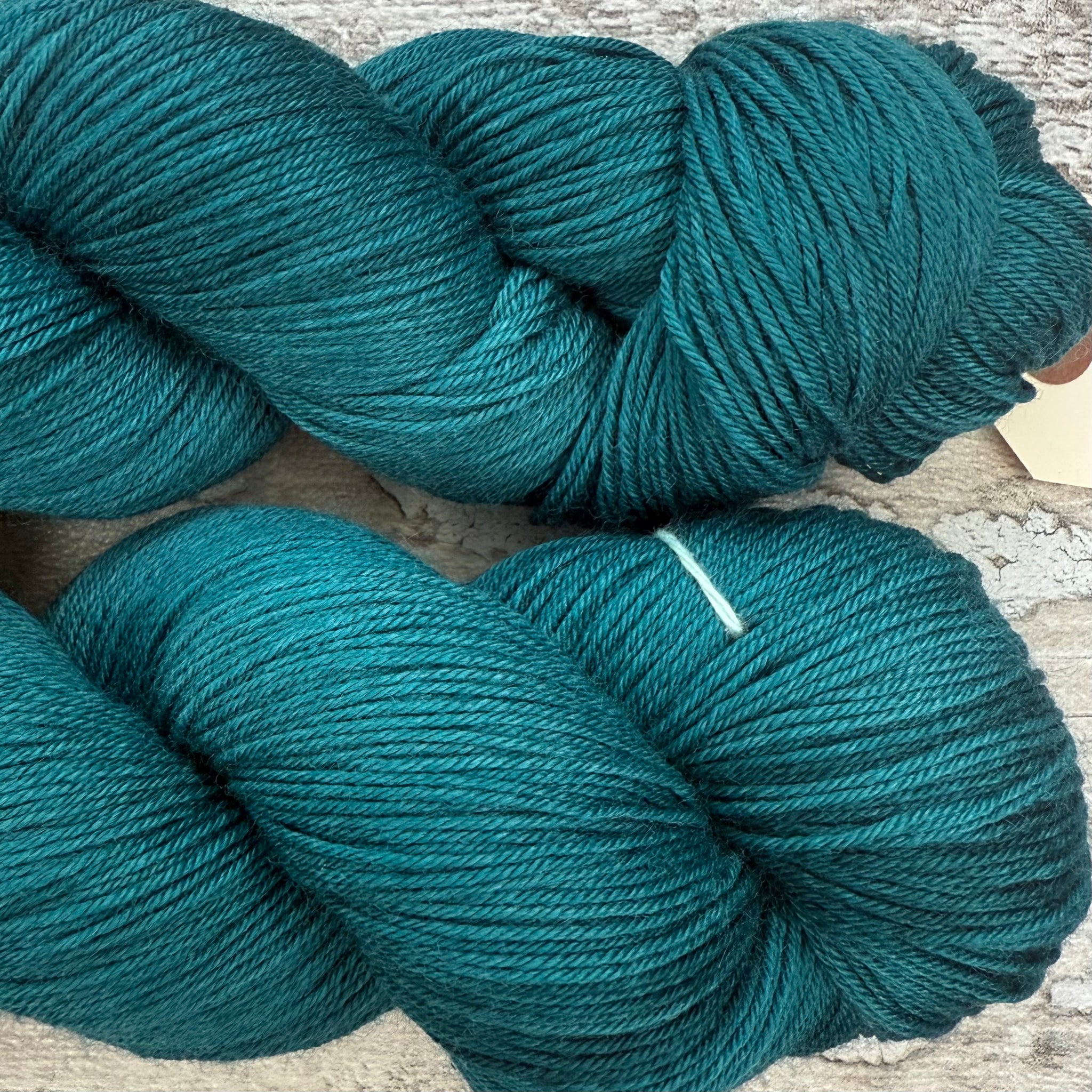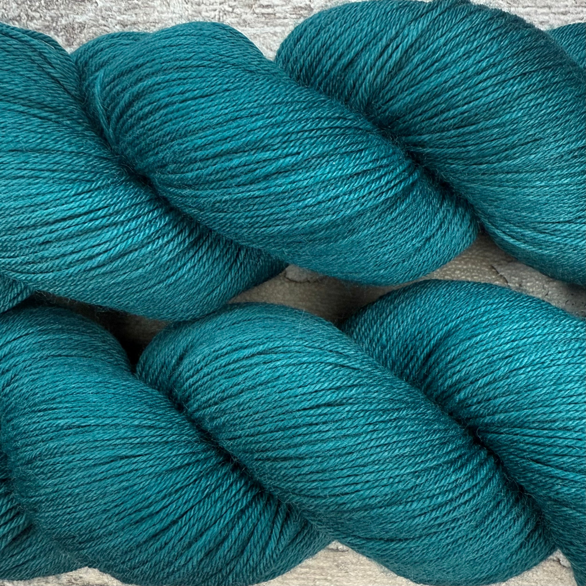 A beautiful solid teal on superwash treated sock yarn. Spun from 75% merino wool that’s soft and warm with 25% nylon for enhanced durability. Around 420 metres per 100g skein. Suitable for 2-3mm needles or hook.