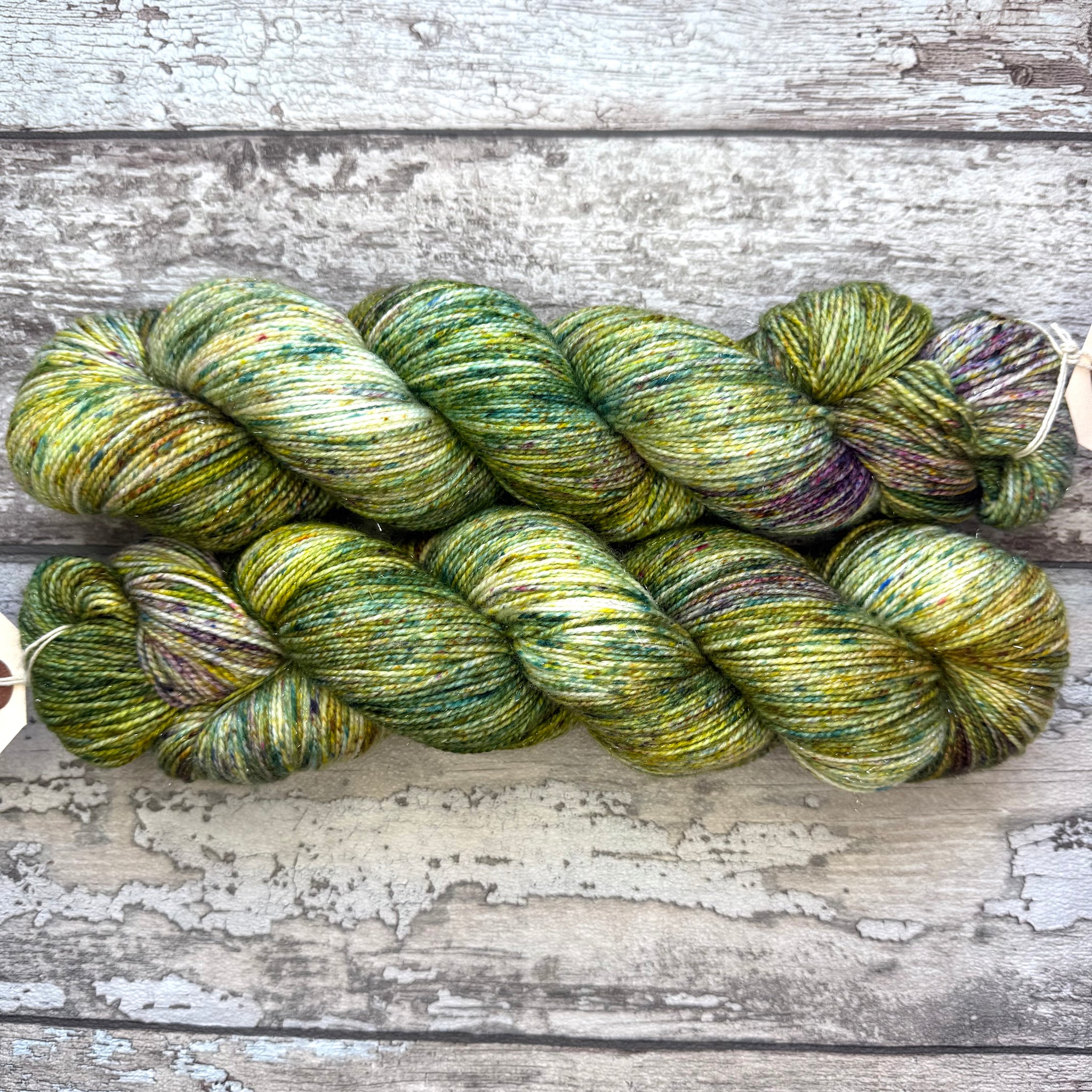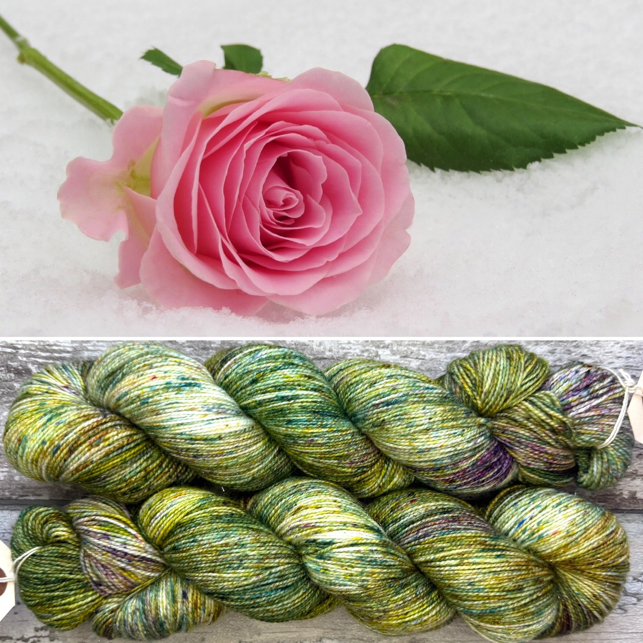 A beautiful Christmas rose. Mixed natural greens and a touch of blush on a cool white background. Each skein is unique as the speckles are allowed to fall “randomly” and has a delightful silver sparkle.