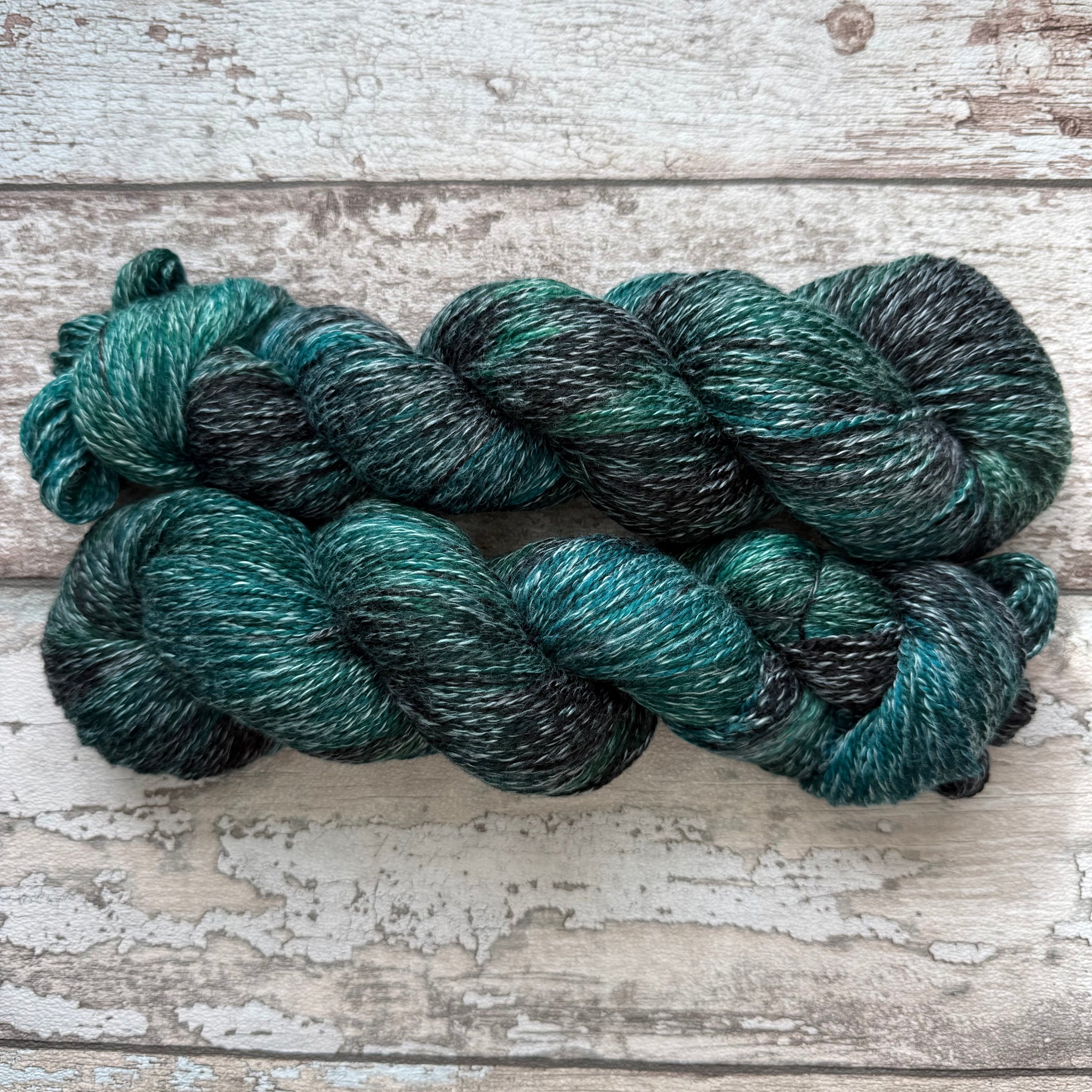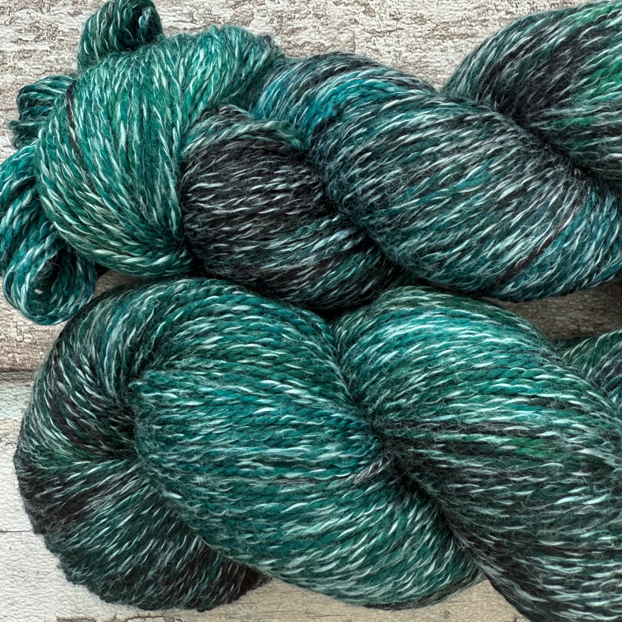A variegated mix of stunning teals and dark black, beautiful and deep, like the ocean. I created this effect by using dyes that bind to the wool but not the cotton for a beautiful glint of white surf intermixed with glorious ocean teals.