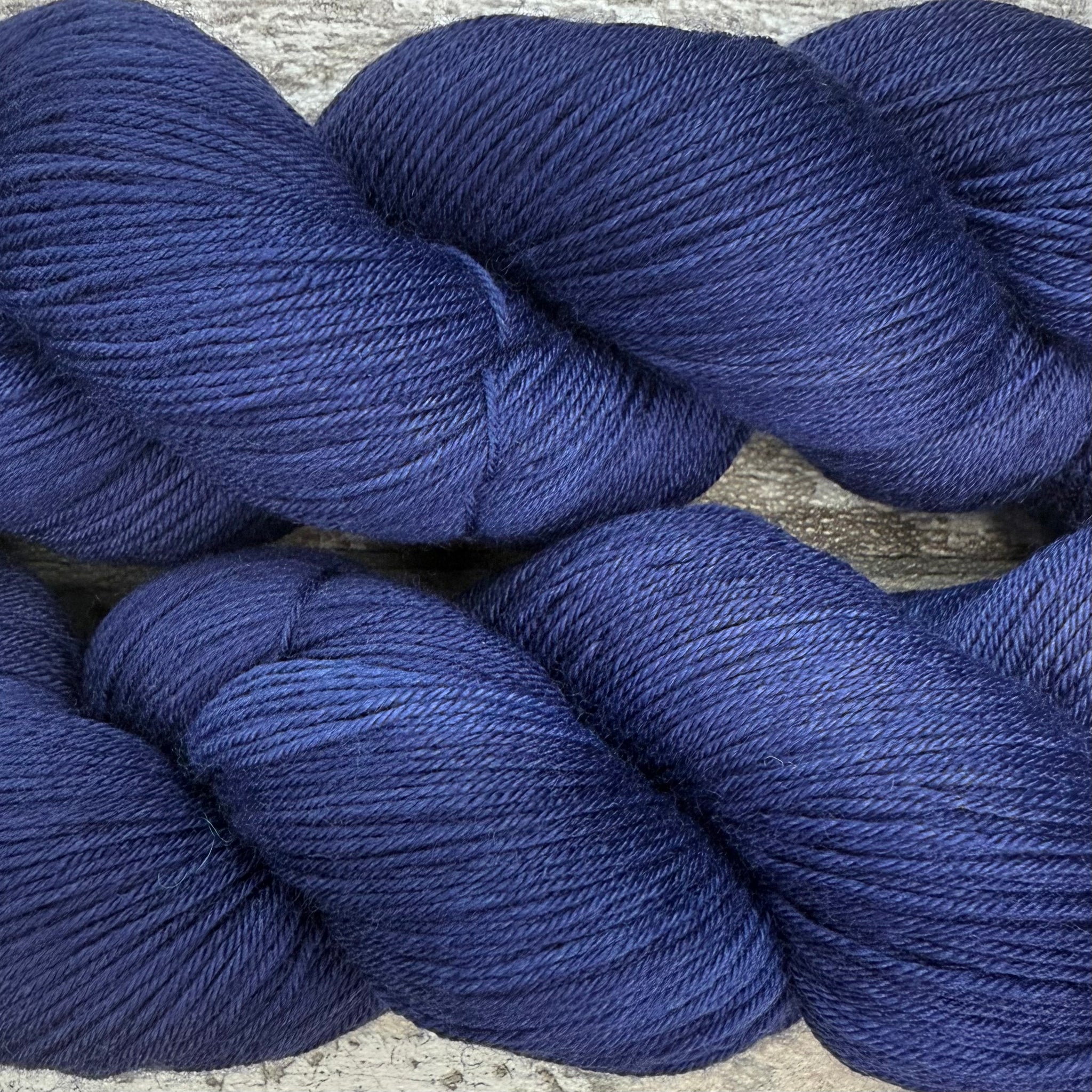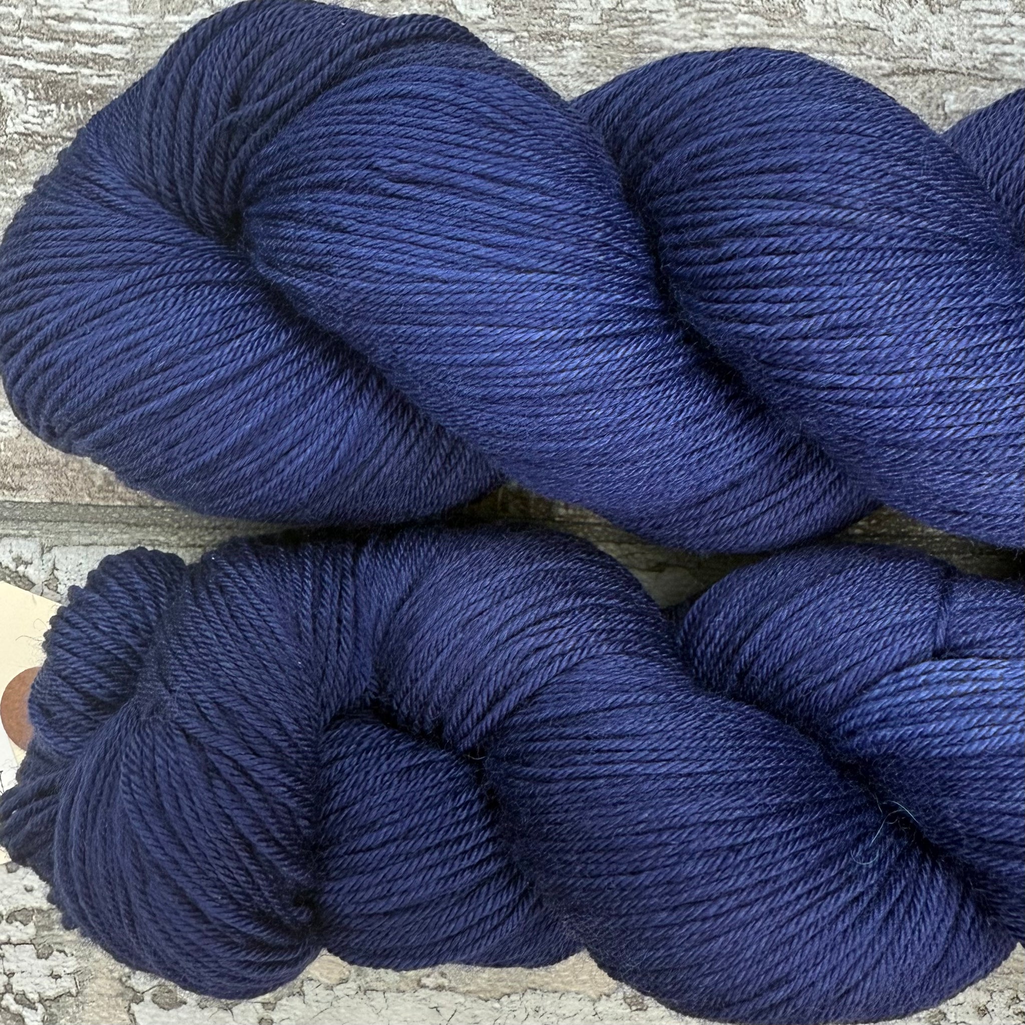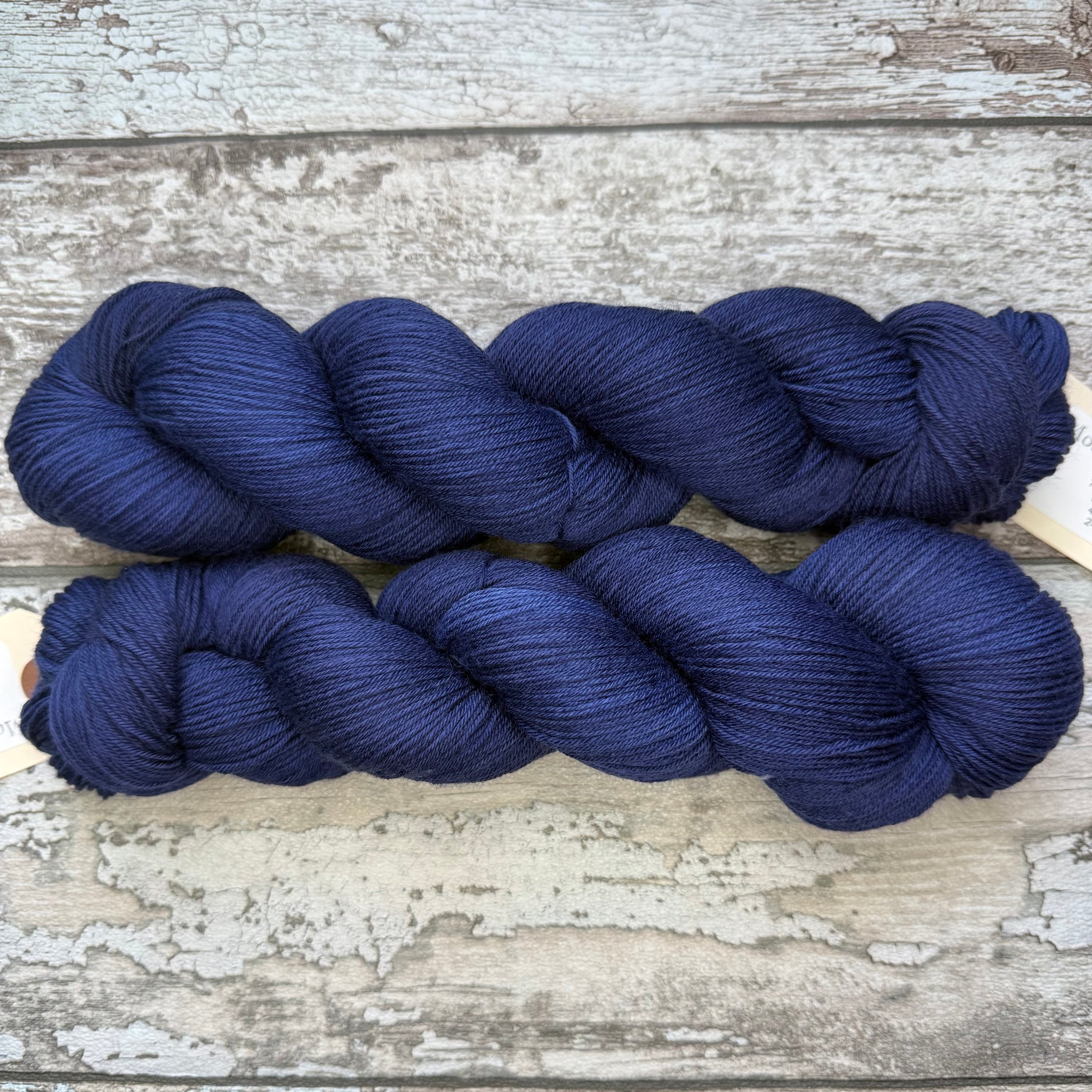 A beautiful near solid navy blue. It is a superwash treated 4ply sock weight with 75% merino wool for softness and warmth and 25% nylon for strength and durability. Around 420 metres per 100g skein. Suitable for 2-3mm needles.