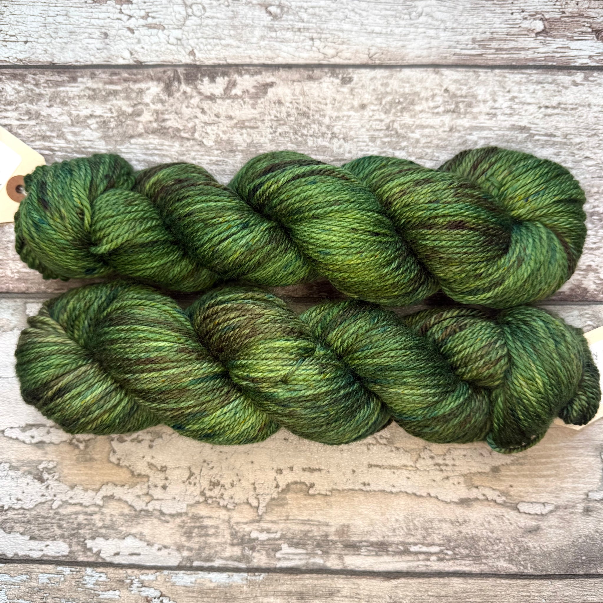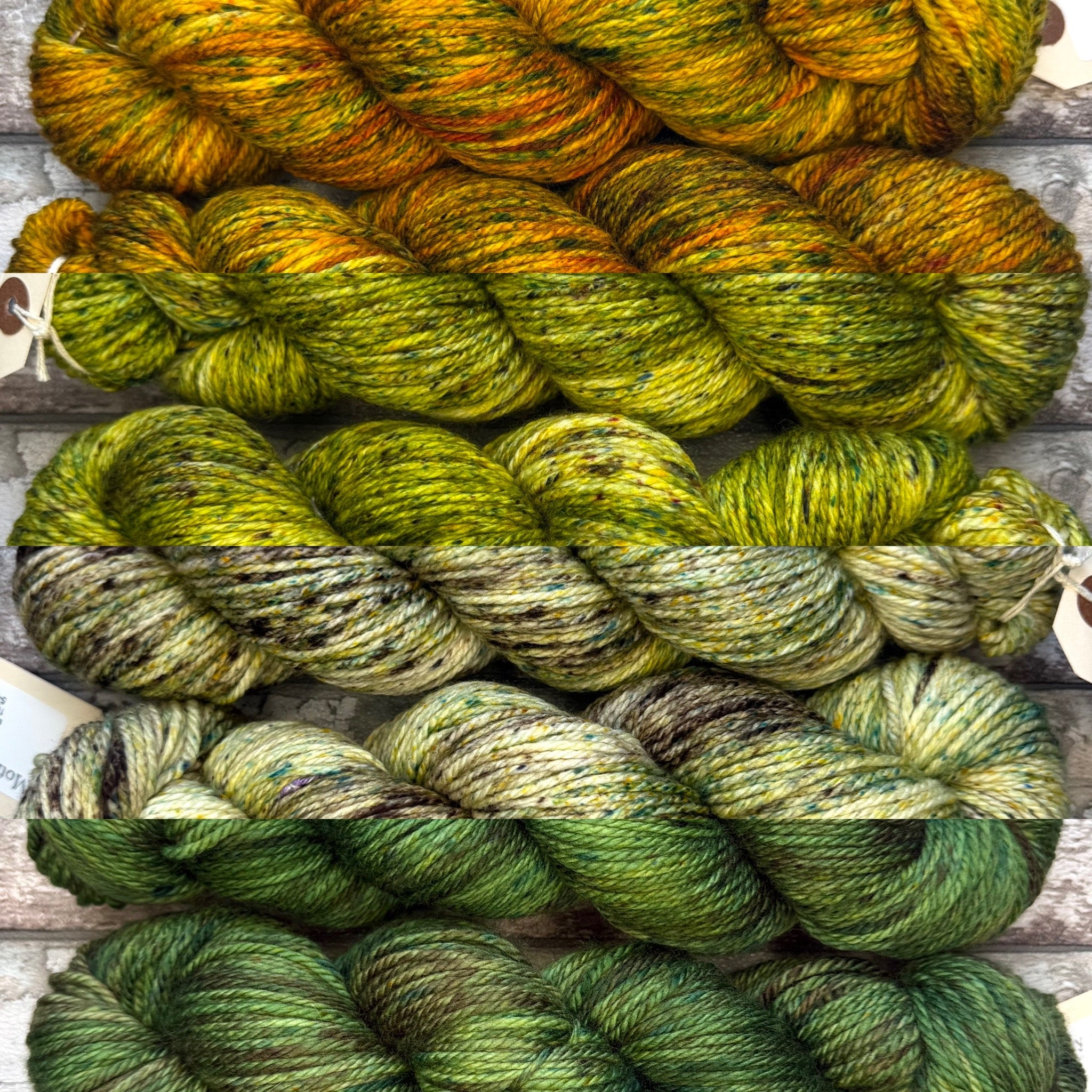 For this complex colourway I first fix speckles in three different shades of green and then overdye with foliage green to create a leafy camouflage mix that mimics the colours that allow these frogs to chill in a leaf without being seen by predators. The underlying speckles provide a visual effect similar to the frogs textured skin while the yarn stays soft and smooth.